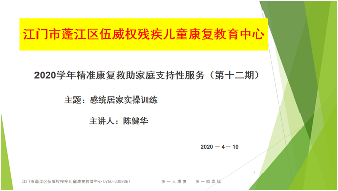 2021年4月10日蓬江区伍威权残疾儿童康复教育中心举办第十二期支持性服务计划,主题是:感统居家实操训练。