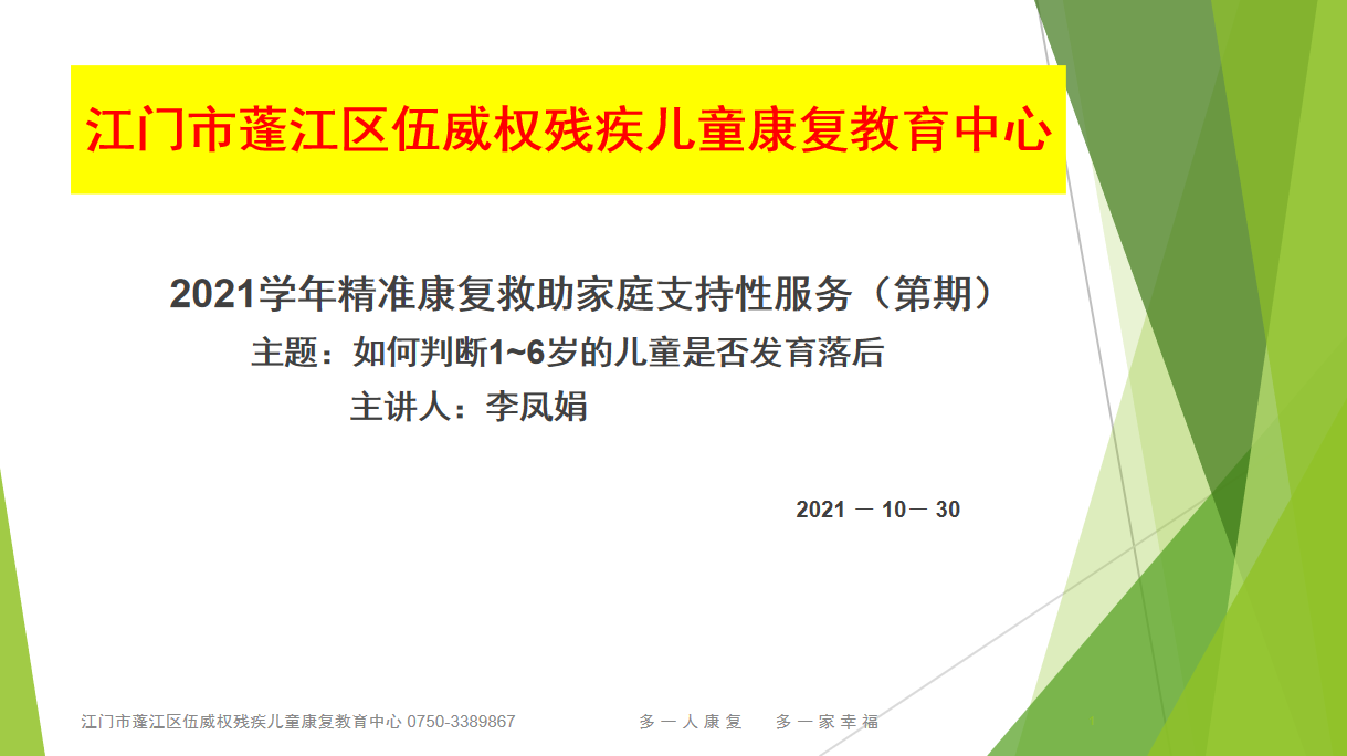 2021年10月30日下午,伍威权残疾儿童康复教育中心如期举办第四期精准康复家庭支持性计划,本期学习主题是:如何判断1~6岁孩子是否发育落后。